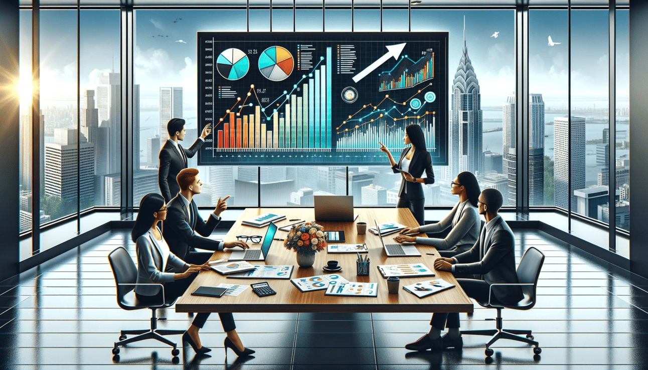 "Illustrative PNG image of a sleek modern office with large windows offering a view of a bustling city. A polished wooden table features an open laptop showcasing vibrant bar and pie charts indicating financial growth, surrounded by organized documents, a coffee cup, and a calculator. A whiteboard in the backdrop displays financial terms and a rising arrow. To one side, a diverse trio of professionals — a woman of Asian descent, another woman of African descent, and a man of Caucasian descent — engage in animated discussion, pointing at the charts and highlighting teamwork and collaboration."
